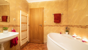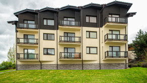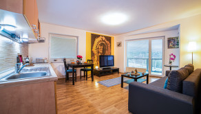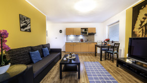 Apartmán pozostáva zo vstupnej chodby resp. predsiene so šatníkom, vzdušnej obývacej izby spojenej s kuchyňou a jedálenskou časťou, spálne, a vkusnej kúpeľne v príjemných zemitých farbách s komfortnou rohovou vaňou a WC. Vykurovanie je lokálne, prostredníctvom vlastného plynového kotla umiestneného v kúpeľni. V kúpeľni je k dispozícii aj automatická práčka, ktorá je praktickým pomocníkom najmä pri dlhodobejších pobytoch. Z obývacej izby je vstup priamo na balkón, kde si posedíte pri kávičke alebo dobrom poháriku a vychutnáte si prekrásnu panorámu Vysokých Tatier. Apartmán disponuje plne vybavenou kuchynskou linkou so všetkým, čo je potrebné k pobytu (hrnce, taniere, príbory, poháre, a pod.), kávovarom na kapsule, rýchlovarnou kanvicou, hriankovačom, chladničkou s mrazničkou, mikrovlnnou rúrou a elektrickou varnou doskou s digestorom. Obývacia izba disponuje pohovkou, satelitnou TV a DVD prehrávačom s cca desiatkou DVD nosičov od detských rozprávok, cez komédie, dobrodružné filmy až po thrillery. V spálni sa nachádza manželská posteľ a rozťahovacie kreslo, na ktorom sa pohodlne vyspí ďalšia dospelá osoba. Samozrejmosťou je bezplatné Wi-Fi pripojenie.