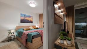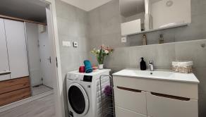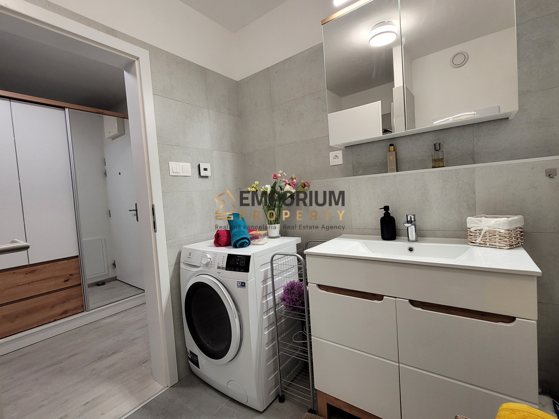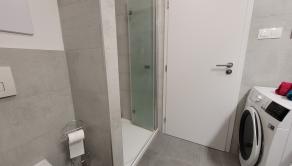 Po večeri poteší útulná kúpeľnička so sprchovacím kútom, v ktorej máte k dispozícii zrkadlovú skrinku s odkladacím vnútorným priestorom ako aj práčku so sušičkou. Elegantne sa tak vyhnete otravnému rozkladaniu sušiaka na bielizeň a zmenšeniu vlastného životného priestoru (sušiaky proste vždy zavadzajú, nech sú umiestnené kdekoľvek :-)).
